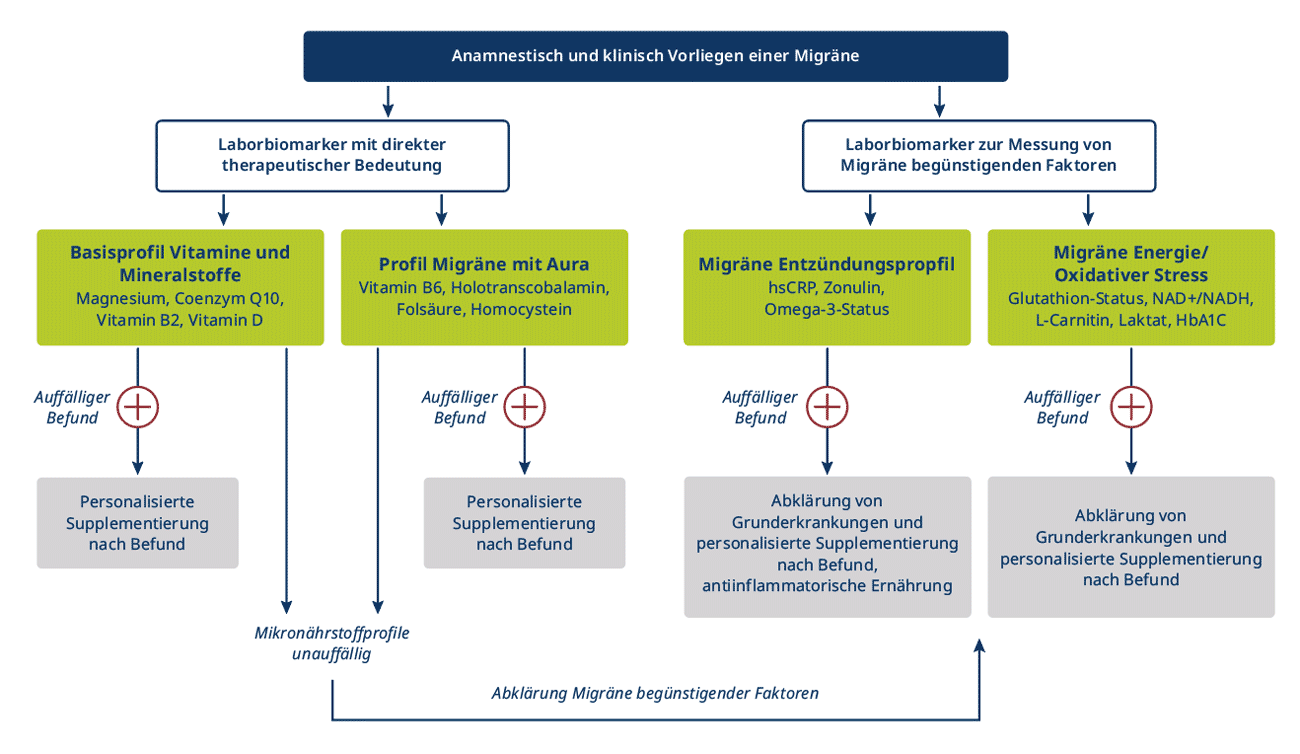 Die hier vorgeschlagenen Laboruntersuchungen gehen über die standardisierte Diagnostik hinaus. Sie basieren auf neueren Studien zu Energiestoffwechsel, Entzündung und Darmmikrobiom bei Migräne und können helfen, individuelle Stellschrauben für eine personalisierte Therapie zu identifizieren.