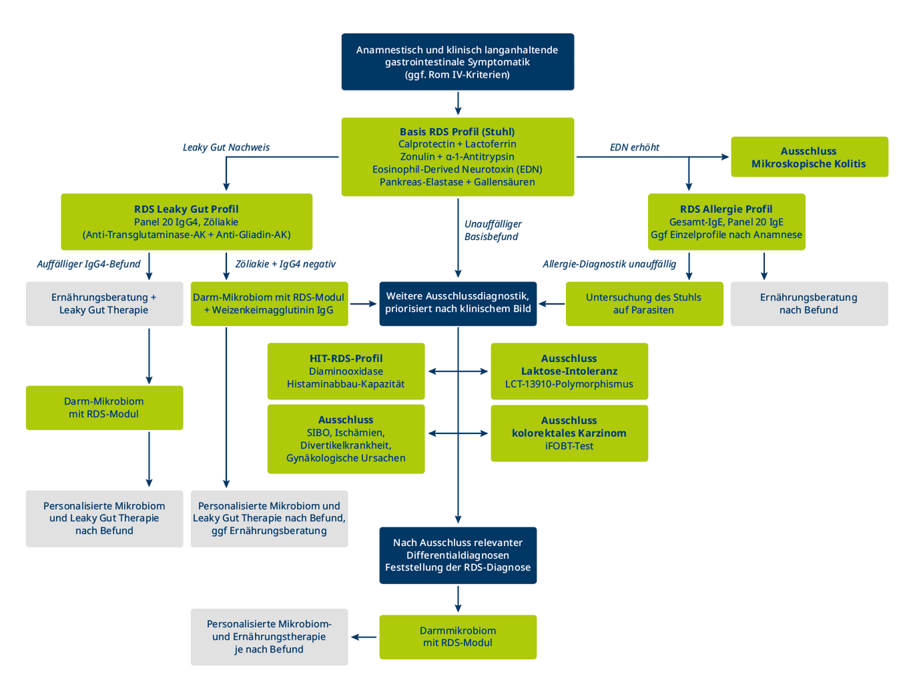 Ergibt das RDS-Basisprofil keine Auffälligkeiten, richtet sich das weitere diagnostische Vorgehen nach der klinischen Symptomatik. Bei Verdacht auf Histaminintoleranz kann das HIT-RDS-Profil zur Abklärung herangezogen werden, das sowohl die DAO-Aktivität als auch die totale Histaminabbaukapazität misst. Eine mögliche Laktoseintoleranz lässt sich genetisch ausschließen. Bei noch nicht lange bestehenden Symptomen ist aufgrund des erhöhten Risikos besonders auf das kolorektale Karzinom zu achten, dessen Ausschluss mittels immunoogischem Stuhltest (iFOBT) erfolgt. Weitere differenzialdiagnostisch relevante gastrointestinale oder gynäkologische Erkrankungen werden in der Regel nicht primär laborchemisch, sondern bildgebend oder klinisch abgeklärt.